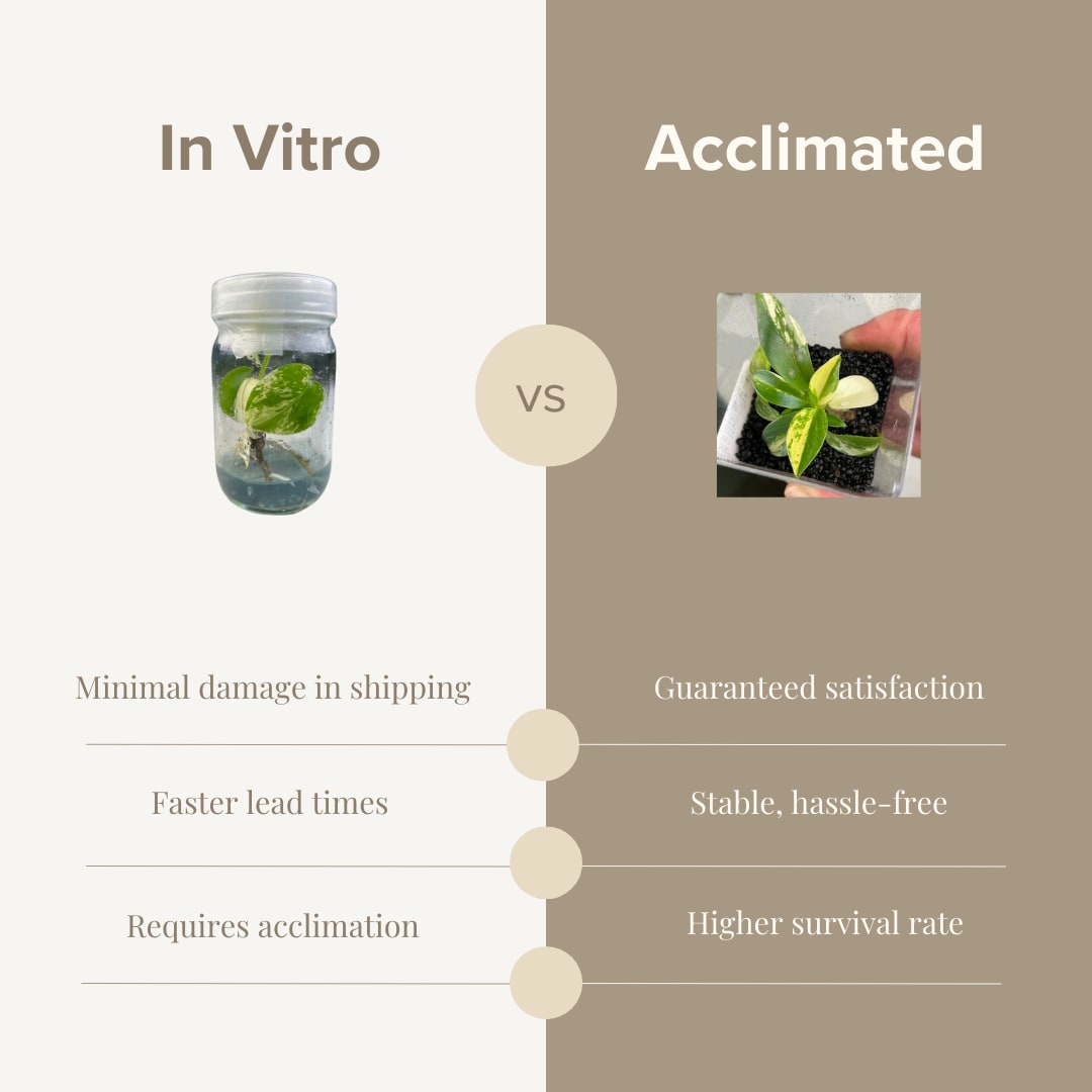 It generally takes 5-12 weeks from the time the order is placed for you to receive the plant, but it may take longer, especially during winter months. Acclimated plants are shipped in soil or substrate, while bare root plants are shipped bare root wrapped in moss. We offer a Premium Select option for top picks from each batch (better roots, leaves, or variegation). Feel free to reach out with any questions.